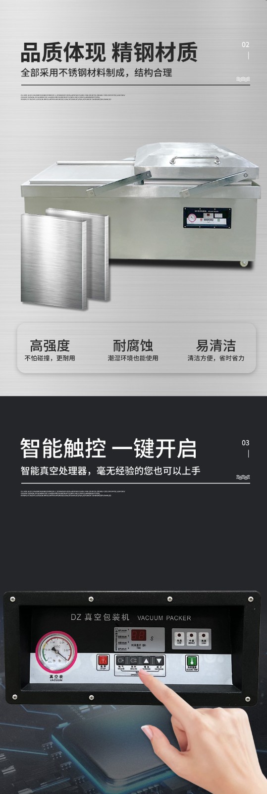 - 材質(zhì):優(yōu)質(zhì)品牌通常采用 304 不銹鋼制作機(jī)身和真空室,如諸城冠通機(jī)械的 600 型素肉雙室真空包裝機(jī),其真空室采用超厚 304 不銹鋼板,厚度達(dá) 4mm,長(zhǎng)期使用不變形、不漏氣13。而一些低價(jià)品牌可能使用普通不銹鋼甚至是鐵材質(zhì)外包不銹鋼皮,容易生銹腐蝕,影響機(jī)器壽命和包裝質(zhì)量。