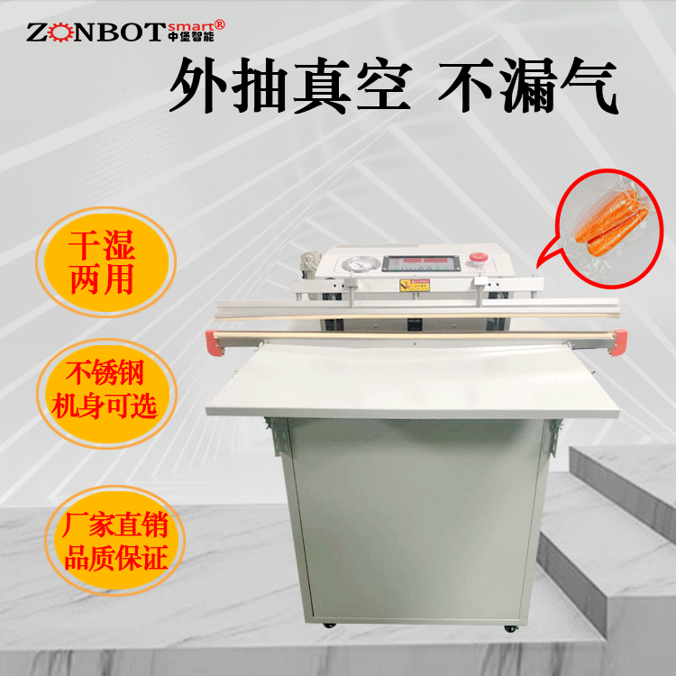 外抽真空包裝機的工作原理是將包裝袋置于真空室外的工作臺上,通過抽氣嘴伸入包裝袋內,然后啟動真空泵,抽出包裝袋內的空氣,達到設定的真空度后,進行封口操作,完成包裝過程。