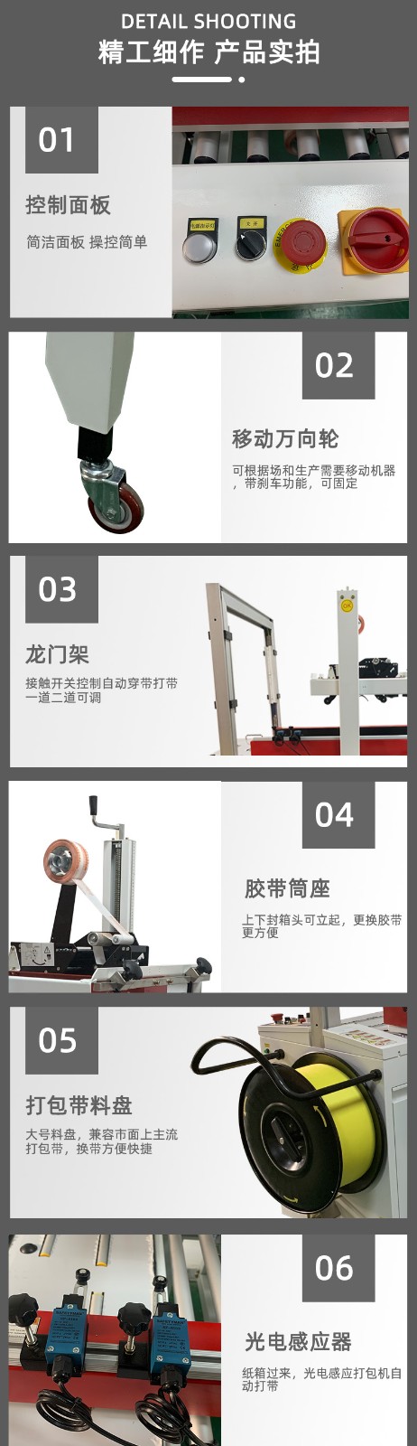 - 打包部分:封箱后的箱子繼續向前移動,進入打包區域。打包機自動將打包帶纏繞在箱子上,并進行拉緊、熱熔焊接等操作,將箱子牢固地打包在一起。
