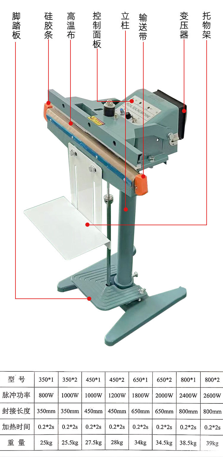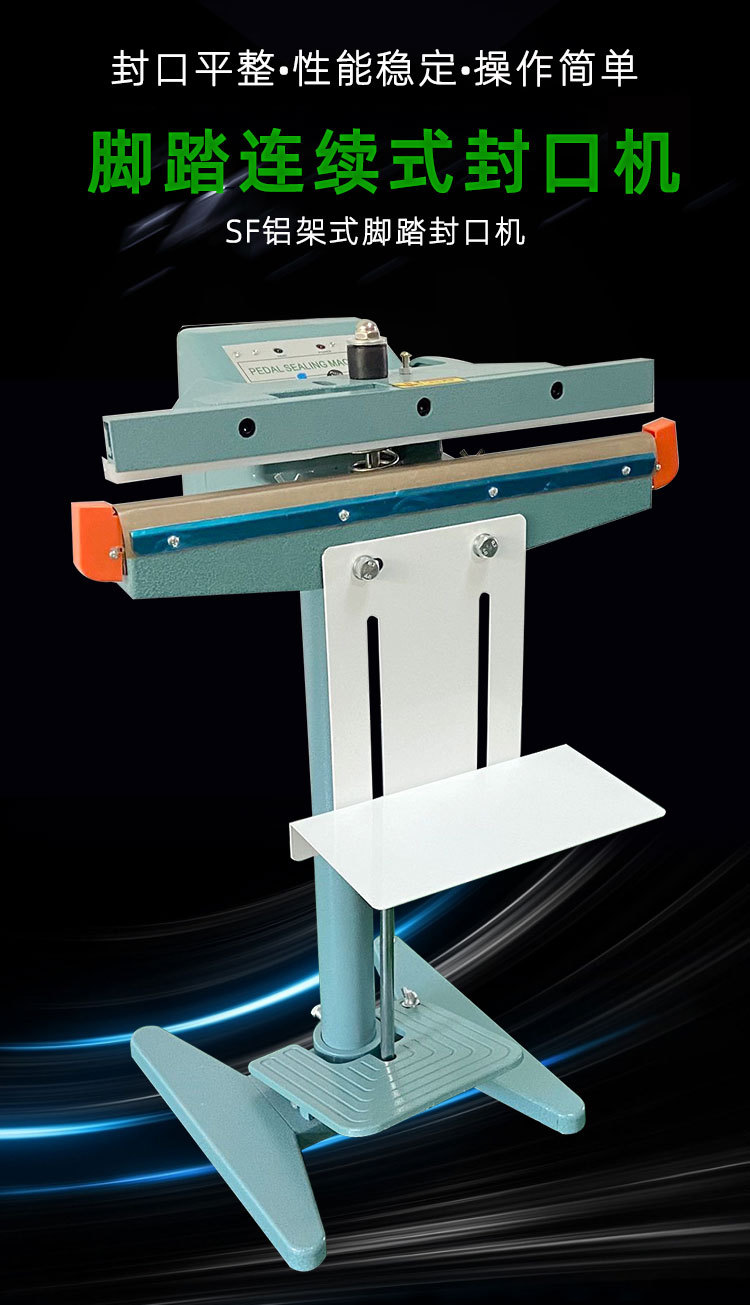 鋁架腳踏封口機可以用于多種包裝材料的封口,如常見的塑料薄膜(聚乙烯、聚丙烯等)、鋁箔復合膜等