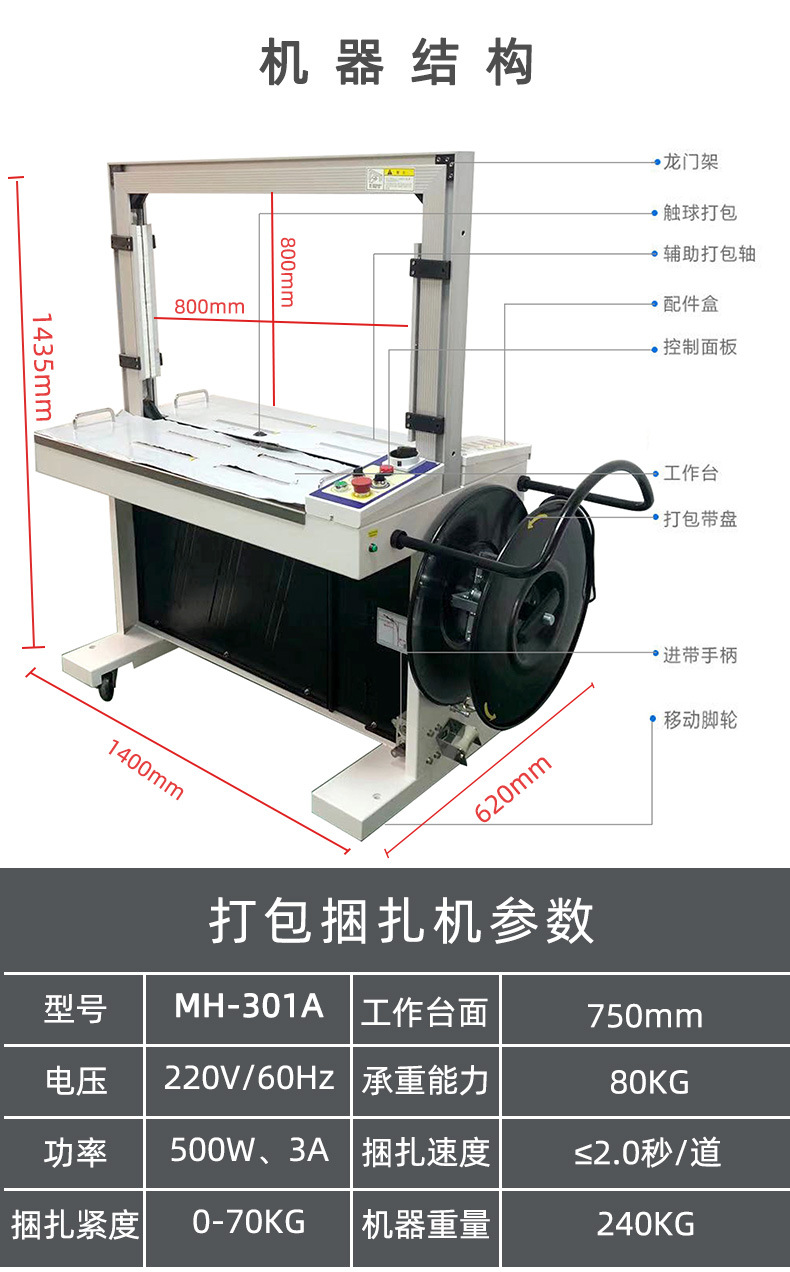 - 適應性強:可以適應多種不同形狀、大小和重量的物品打包。通過調整傳送帶的速度、打包帶的供給方式和拉緊力度等參數,能夠對各種產品包裝箱、托盤貨物等進行有效打包。同時,它還能兼容多種類型的打包帶,如 PP(聚丙烯)打包帶、PET(聚對苯二甲酸乙二醇酯)打包帶、鋼帶等,根據不同的包裝需求選擇合適的打包帶。