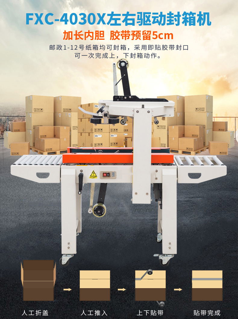 - 有膠帶支架、膠帶切割裝置和膠帶粘貼裝置等部分。膠帶支架用于放置膠帶卷,膠帶切割裝置能夠準確地將膠帶切斷,避免膠帶過長或過短影響封箱效果。膠帶粘貼裝置則通過壓力滾輪等結構將膠帶粘貼在紙箱上,并且可以調整粘貼的壓力,適應不同厚度的紙箱。
