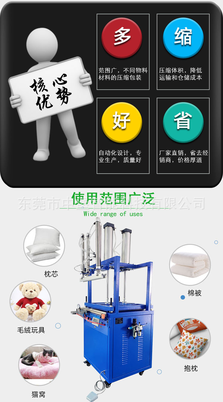 真空壓縮包裝機的壓縮功能衣物、棉被、海綿制品經壓縮后,倉儲或收納空間占用大幅減少