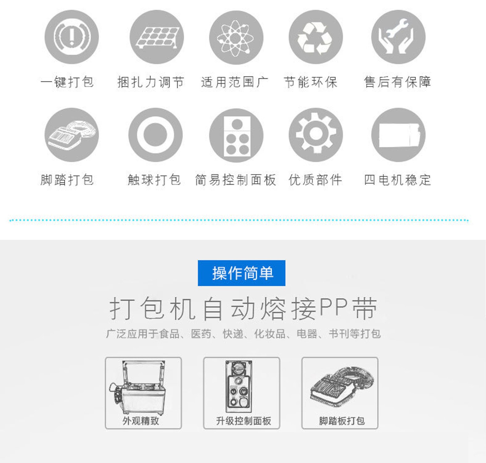 - 自動打包機主要依靠機械傳動與控制系統(tǒng)協(xié)同作業(yè)。將物品放置在指定位置后,通過傳感器感知,啟動電機運轉,帶動送帶、拉緊、切帶等一系列動作。送帶輪把打包帶從帶盤輸送至待打包物體周圍,隨后拉緊裝置發(fā)力,讓打包帶緊緊束縛物品,最后切帶裝置精準切斷打包帶,一個打包流程就此完成 ,部分高端機型還具備自動貼標功能。