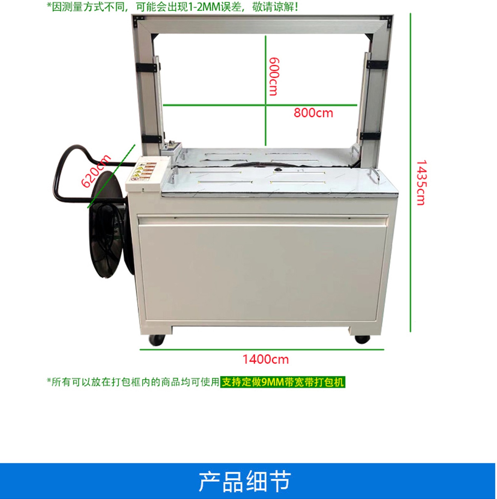 - 高臺自動打包機:機身較高,一般搭配輸送帶使用,貨物放置在輸送帶上,能自動完成打包流程,適用于較重、體積較大的貨物連續(xù)打包,效率較高。