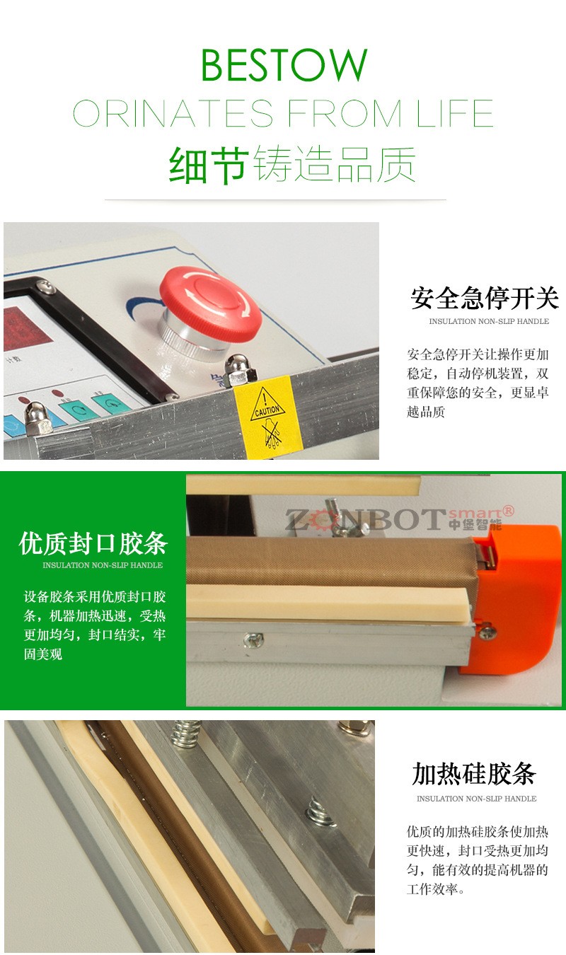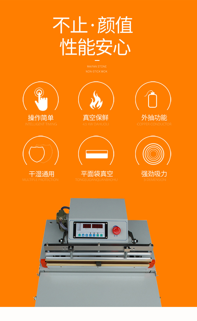 - 設(shè)置完成后,將包裝袋對(duì)準(zhǔn)抽氣嘴,放置在熱封條上,然后按下開(kāi)關(guān),機(jī)器便按設(shè)定的程序開(kāi)始進(jìn)行抽真空、封口、冷卻處理,處理完畢后,將熱封條張開(kāi),將包裝袋拿下即可。