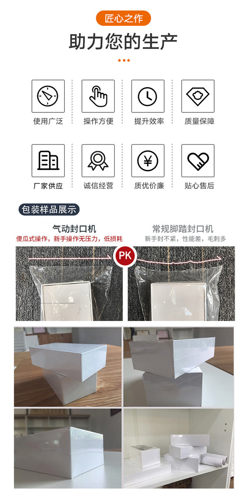 氣動封口機(jī)的封口方式取決于封口頭的形狀和材質(zhì),常見的封口方式有平封和凸槽封。其中,平封主要用于鋁箔袋的封口,凸槽封適用于各種不同的塑料袋和復(fù)合材料袋的封口。無論是哪種封口方式,氣動封口機(jī)都可以通過合適的工作參數(shù)來實(shí)現(xiàn)封口的密封性和穩(wěn)定性。