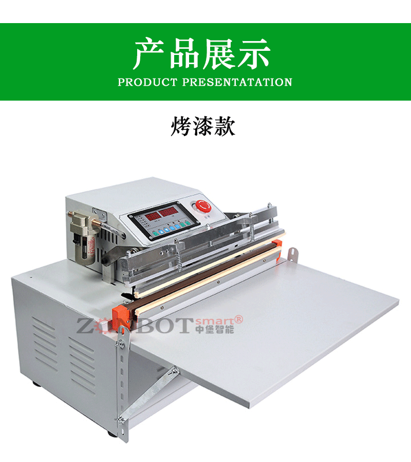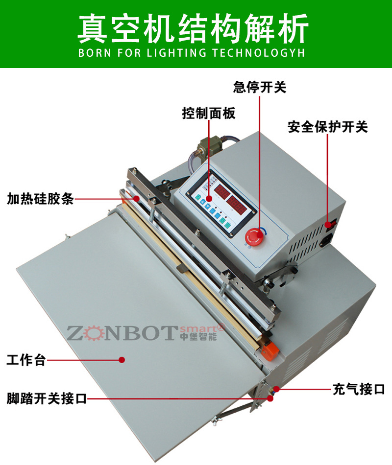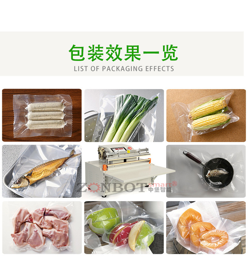 真空包裝機能夠自動抽出包裝袋內的空氣,達到預定真空度后完成封口工序。亦可再充入氮氣或其它混合氣體,然后完成封口工序。真空包裝機常被用于食品行業,因為經過真空包裝以后,食品能夠抗氧化,從而達到長期保存的目的。