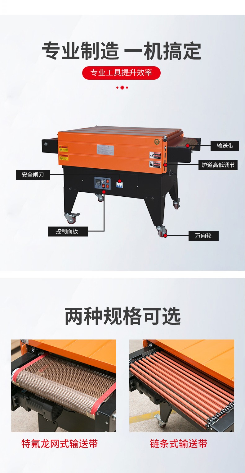 • 能夠實現均勻、緊密的包裝效果。熱空氣的均勻噴射確保了薄膜在產品各個部位的收縮程度一致,使得包裝后的產品外觀更加美觀、整潔。而且,緊密貼合的薄膜可以有效地保護產品免受灰塵、水分等外界因素的侵害。例如,在包裝電子產品時,良好的收縮包裝可以防止靜電吸附灰塵,保護產品內部的電子元件。