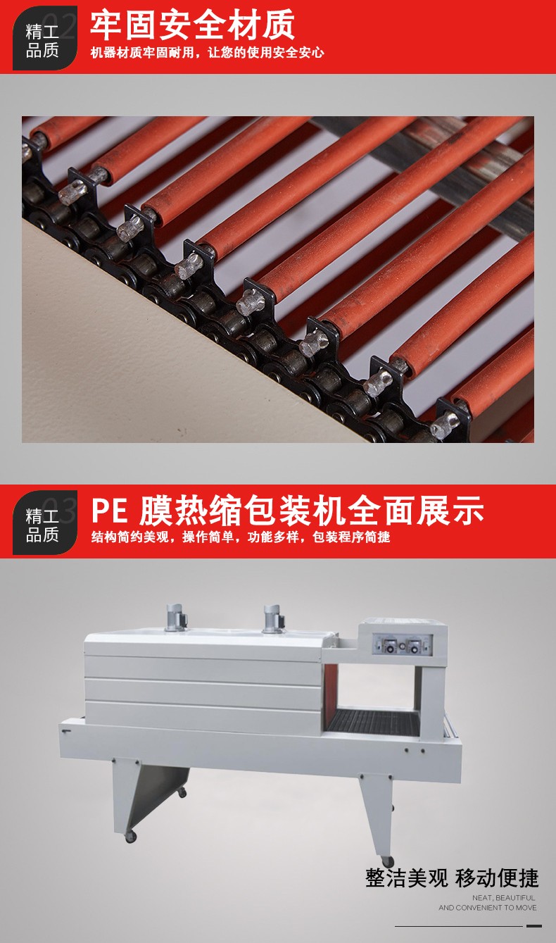 例如,當(dāng)把一個產(chǎn)品用 PE 薄膜包裹好,放入 PE 熱收縮機(jī)中,機(jī)器啟動后,薄膜在熱的作用下,就像被賦予了 “生命力” 一樣,逐漸收縮,最后緊貼在產(chǎn)品的輪廓上,就像給產(chǎn)品穿上了一層定制的保護(hù) “外衣”。