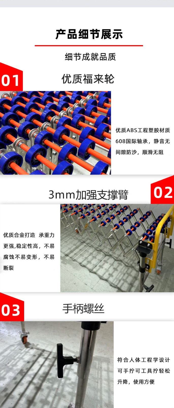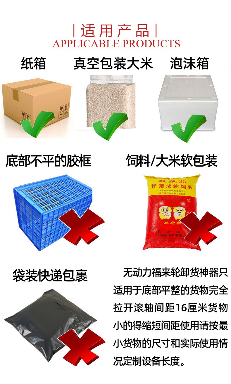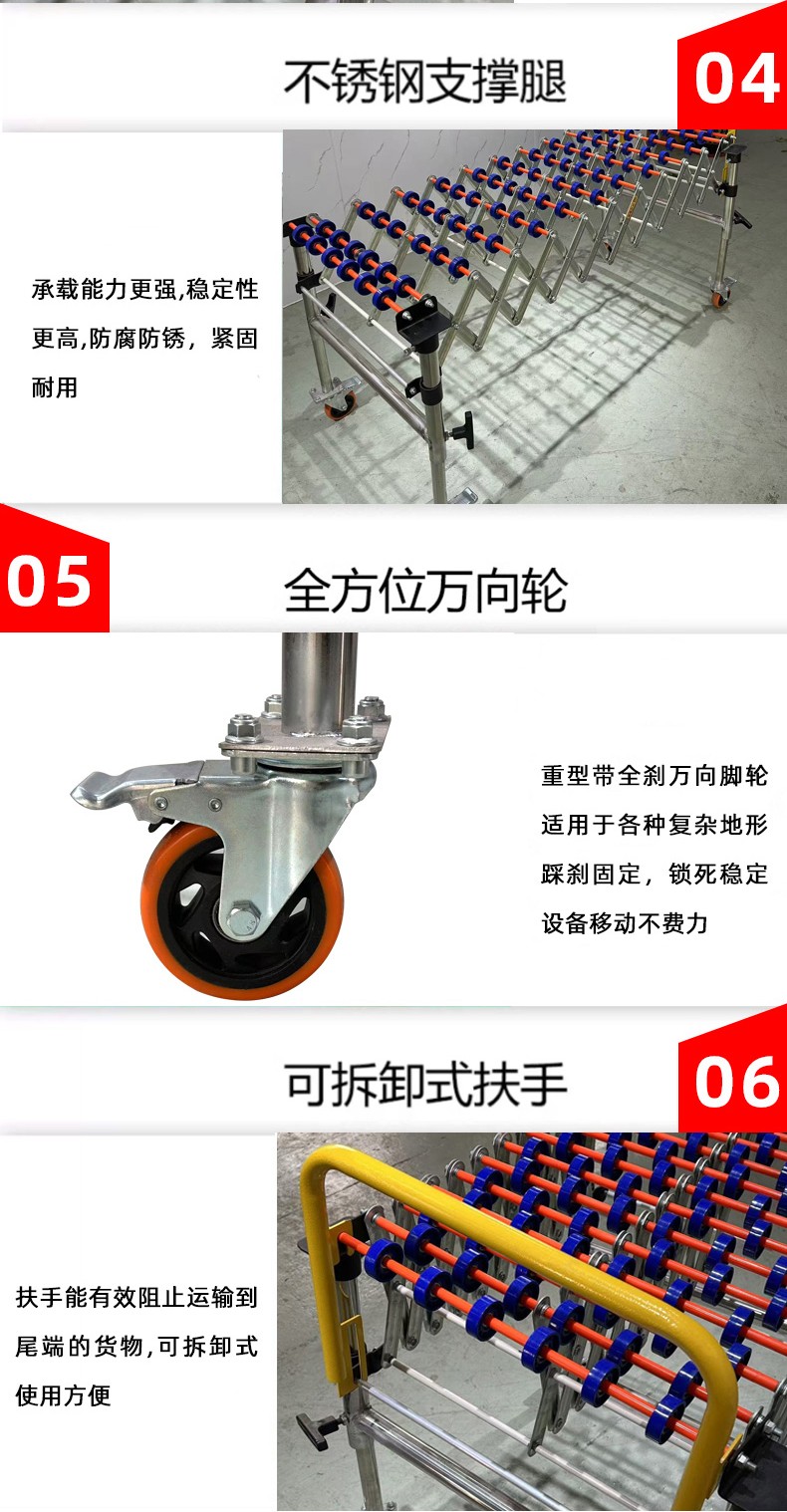 • 通用性強:能夠輸送各種形狀的物體,只要物體底部相對平整,就可以在滾輪上滾動輸送,無論是方形的箱子、圓形的桶還是其他不規則形狀的物品(在一定范圍內)。