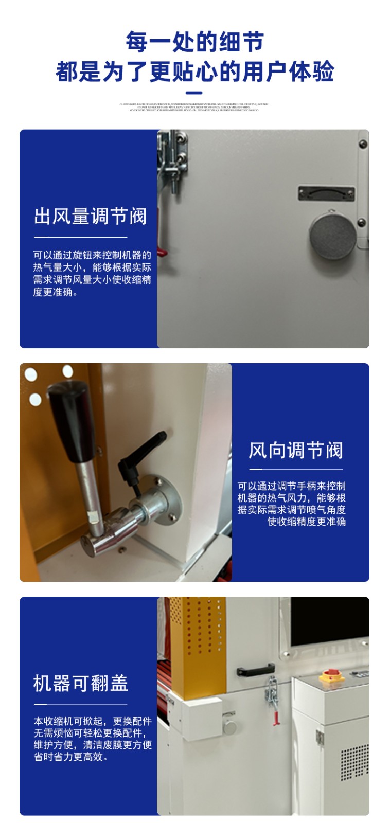 上下封切刀垂直運(yùn)動(dòng),切斷膜材(頂部和底部同時(shí)封切),形成獨(dú)立的 “膜包產(chǎn)品”,同時(shí)廢料(膜邊)通過自動(dòng)收廢系統(tǒng)回收。 - 熱收縮定型: