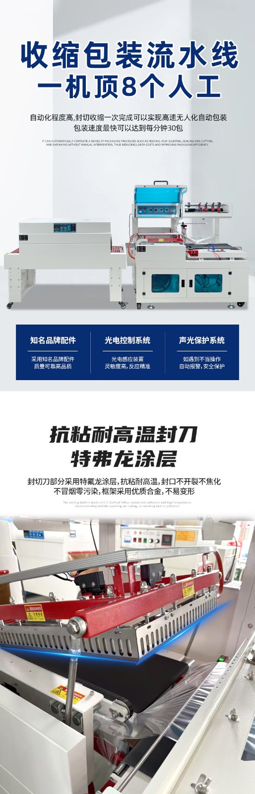 全自動 L 型封切熱收縮包裝機是一種集封包、收縮于一體的自動化包裝設備,廣泛應用于食品、醫藥、日化等多個行業。以下是關于它的詳細介紹: 工作原理:產品通過輸送系統被傳送到封切臺,包裝膜經送膜機構展開并包裹產品,L 型封切刀根據產品尺寸進行封切,形成包裝袋。隨后,產品被送入熱收縮爐,利用熱風對包裝膜進行熱收縮,使包裝緊密貼合產品,最后完成包裝。 設備結構:主要由封切部分和收縮部分組成。封切部分包含封切刀、氣缸、光電傳感器等,封切刀采用抗粘高溫的鋁合金材質,表面有特氟龍涂層。收縮部分由不銹鋼加熱管、內循環熱風