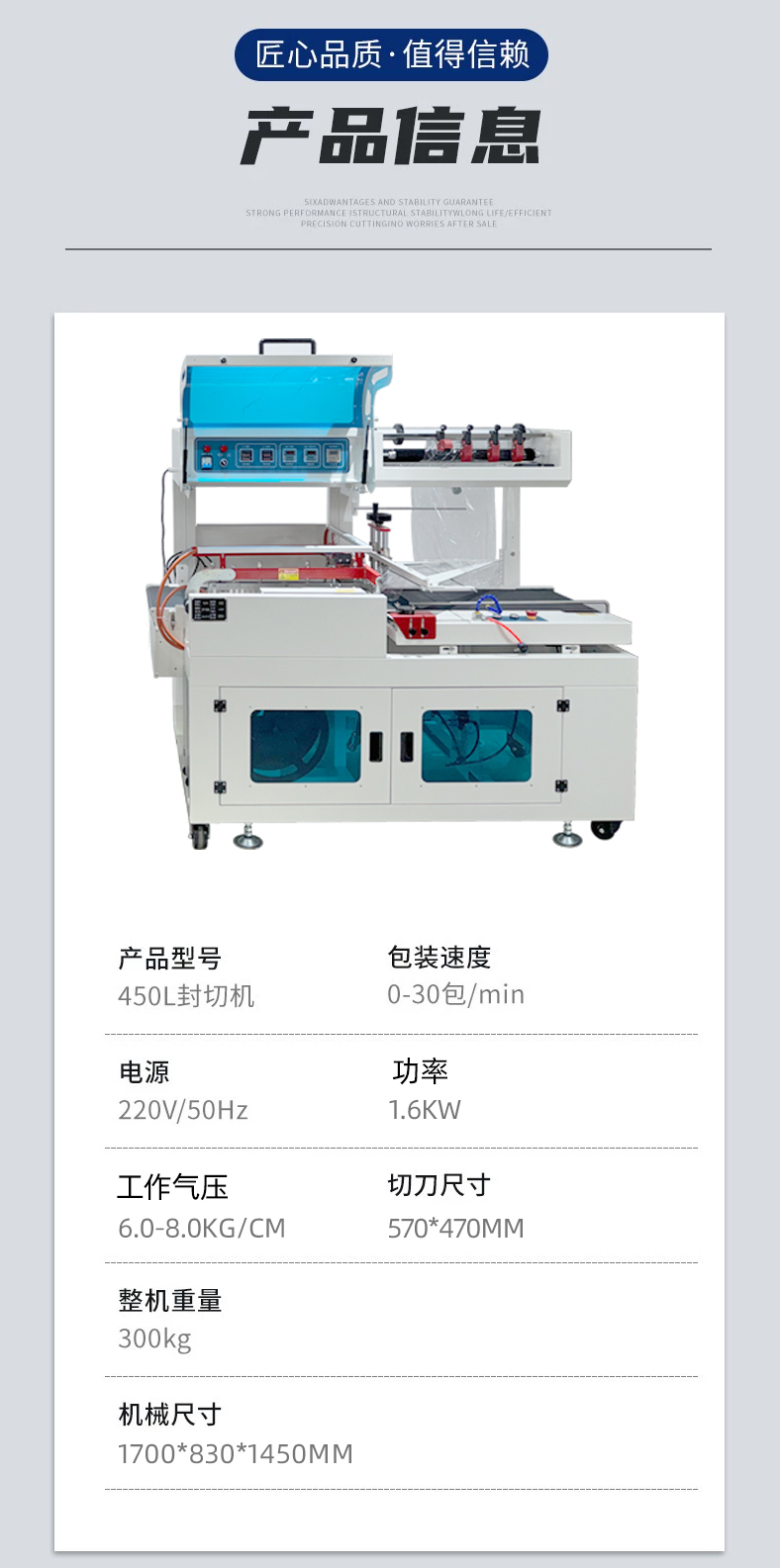 • L 型封切刀(由橫向刀和縱向刀組成,呈 “L” 形)快速下壓,同時通過 “熱封 + 切斷” 一體化動作:先通過加熱條將膜的重疊處熱封(形成密封的 “膜袋” 套住產品),再通過內置切刀切斷多余膜料,完成 “套膜” 工序;