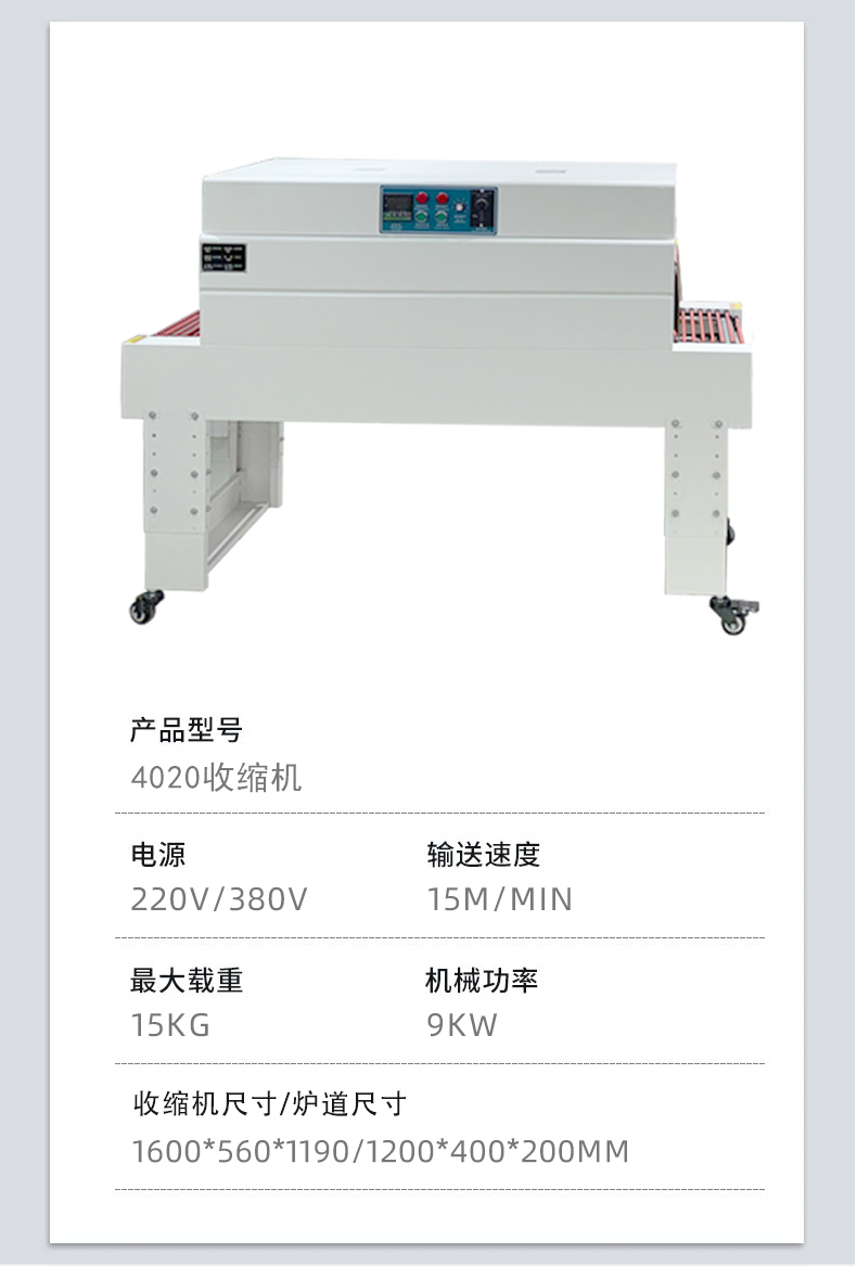 • 設備可通過調節 “輸送帶速度、封切溫度、收縮溫度”,適配不同尺寸產品(通常適用產品尺寸:長 50-600mm、寬 30-400mm、高 20-300mm),從小件(如口紅、藥盒)到中件(如禮盒、小家電)均可包裝。