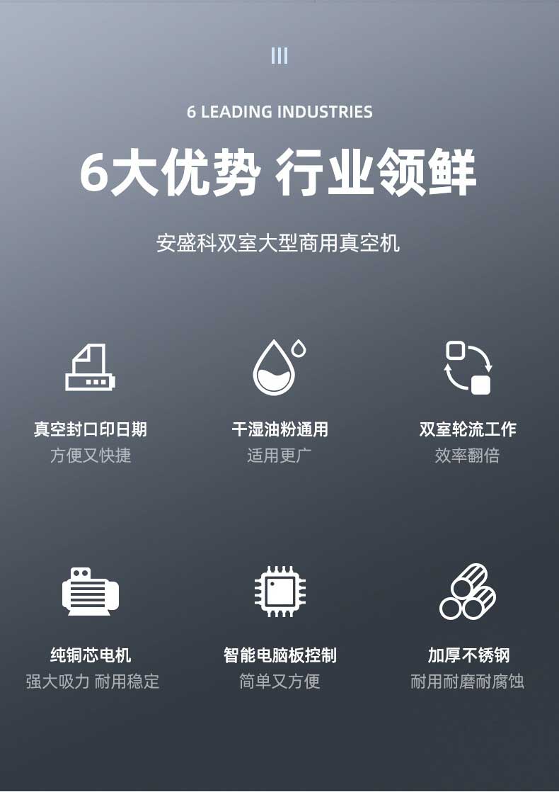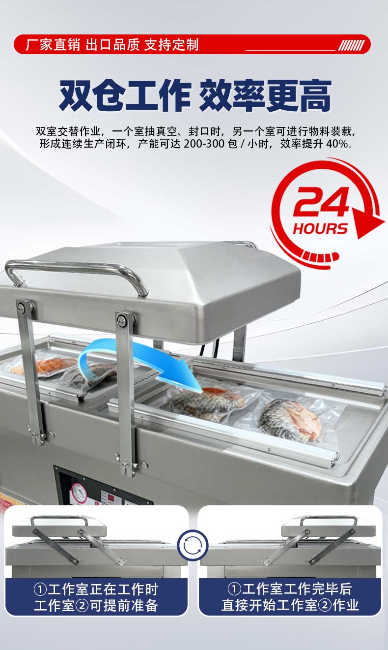 • 雙室設計:一個真空室在抽真空時,另一個真空室可以擺放包裝物,交替工作,節省操作時間,提高包裝效率。
