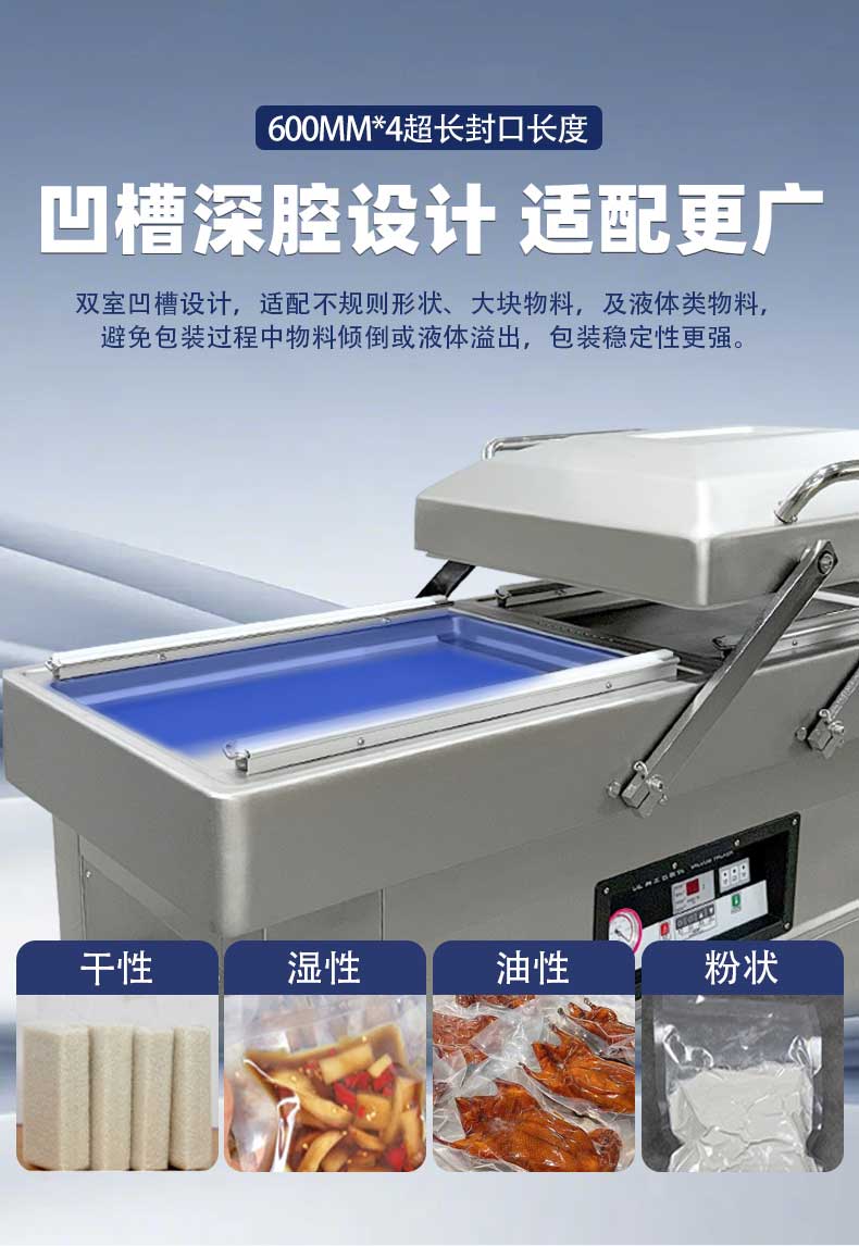 雙室凹槽真空包裝機,專為鹵味、水產、預制菜等帶湯汁、高水分產品量身打造,創新下凹式真空室結構搭配雙室交替工作模式,既解決液體包裝溢漏難題,又大幅提升生產效率,是食品加工、生鮮鎖鮮的得力設備。