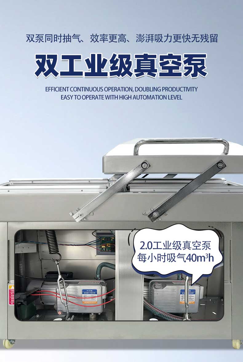 雙室凹槽真空包裝機是一種高效的真空包裝設備,廣泛應用于食品、電子等行業。雙室凹槽真空包裝機通過抽氣泵將袋子內的空氣抽走,形成真空狀態,然后通過熱封機將袋子密封。其主要由真空泵、真空室、熱封機和電控系統組成。具體工作步驟為:將食品放入袋子并置于真空室后,按下啟動按鈕,真空泵抽取袋子內空氣,達到設定真空度后,熱封機進行封口操作,封口完成后設備自動停止。