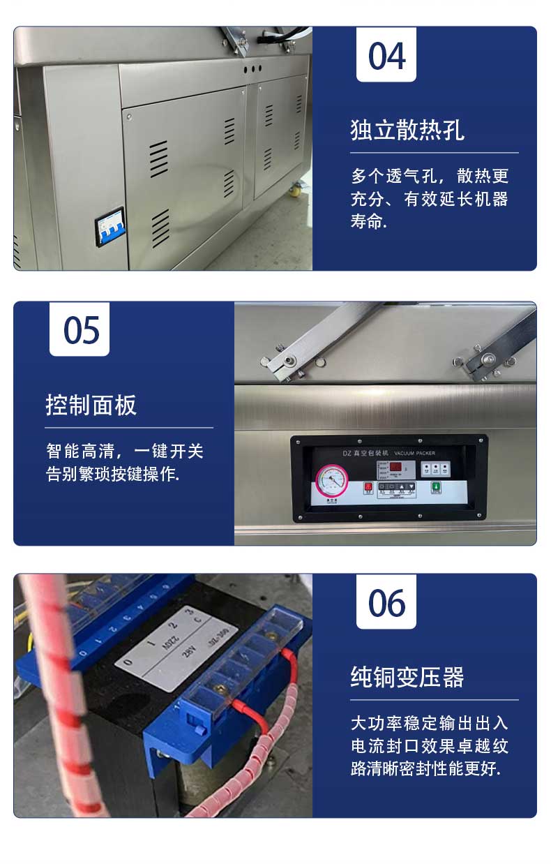 機身通體采用不銹鋼材質,耐腐防銹易清潔,適配食品車間潮濕作業環境,經久耐用。核心配置大功率真空泵,真空度可達 - 0.1MPa,抽氣速度快,能快速抽出包裝袋內空氣,有效抑制細菌滋生,延長產品保鮮期與儲運穩定性。